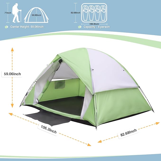 - ⛺ Spacious Camping Tent 4 Person: The versatile double-layer camping tent provides ample space for 4 person to move around,The tent unfolds to 9FTx7FTx5foot.The center height:5 foot,provides more headroom.This roomy camping tent offering comfort and freedom for 4 adults with sleeping bags.Say goodbye to cramped camping quarters
